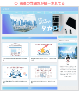 ブログのトップページ、サイドバーなどにアイキャッチ画像を表示する場合は、デザインのトーン・雰囲気を統一しておきましょう。