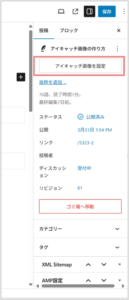 画面右側の「投稿」パネルを展開し、「アイキャッチ画像を設定」をクリックします。