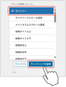 ウィジェットの配置エリアを選んで「ウィジェットを追加」をクリックしましょう。