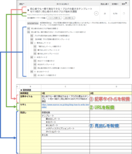 具体的に、記事全体の流れを示す見出しを作成し、それぞれの見出しごとに書きたい内容を「簡単なメモ」として書き留めた(上図の)イメージです。