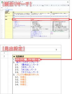 ex:記事構成の作成方法、記事構成の型、記事構成の作成時の注意点…など