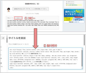 次に、当記事で紹介する吹き出し装飾 HTMLコードをコピーして、WordPress 投稿画面の「カスタムHTML」に張り付けます。