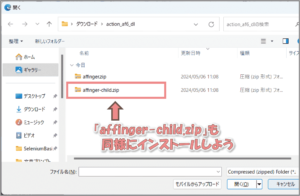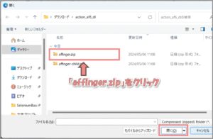 解凍したフォルダの下にある『affinger.zip』を選択して「開く」をクリックします。
