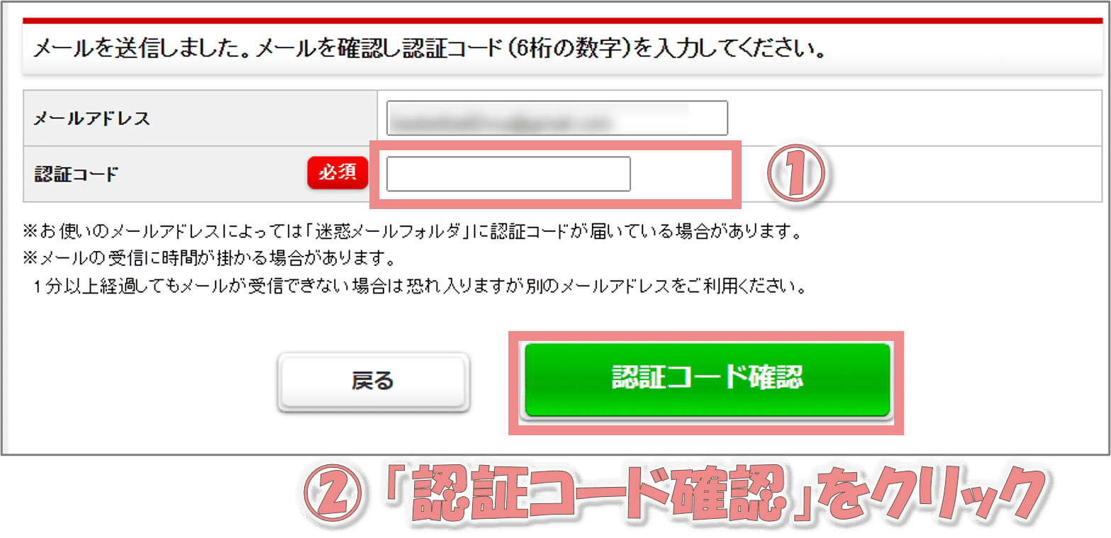 メールアドレス宛に認証コードが送られるので、受信した認証コードを入力して「認証コード確認」をクリックしてください。