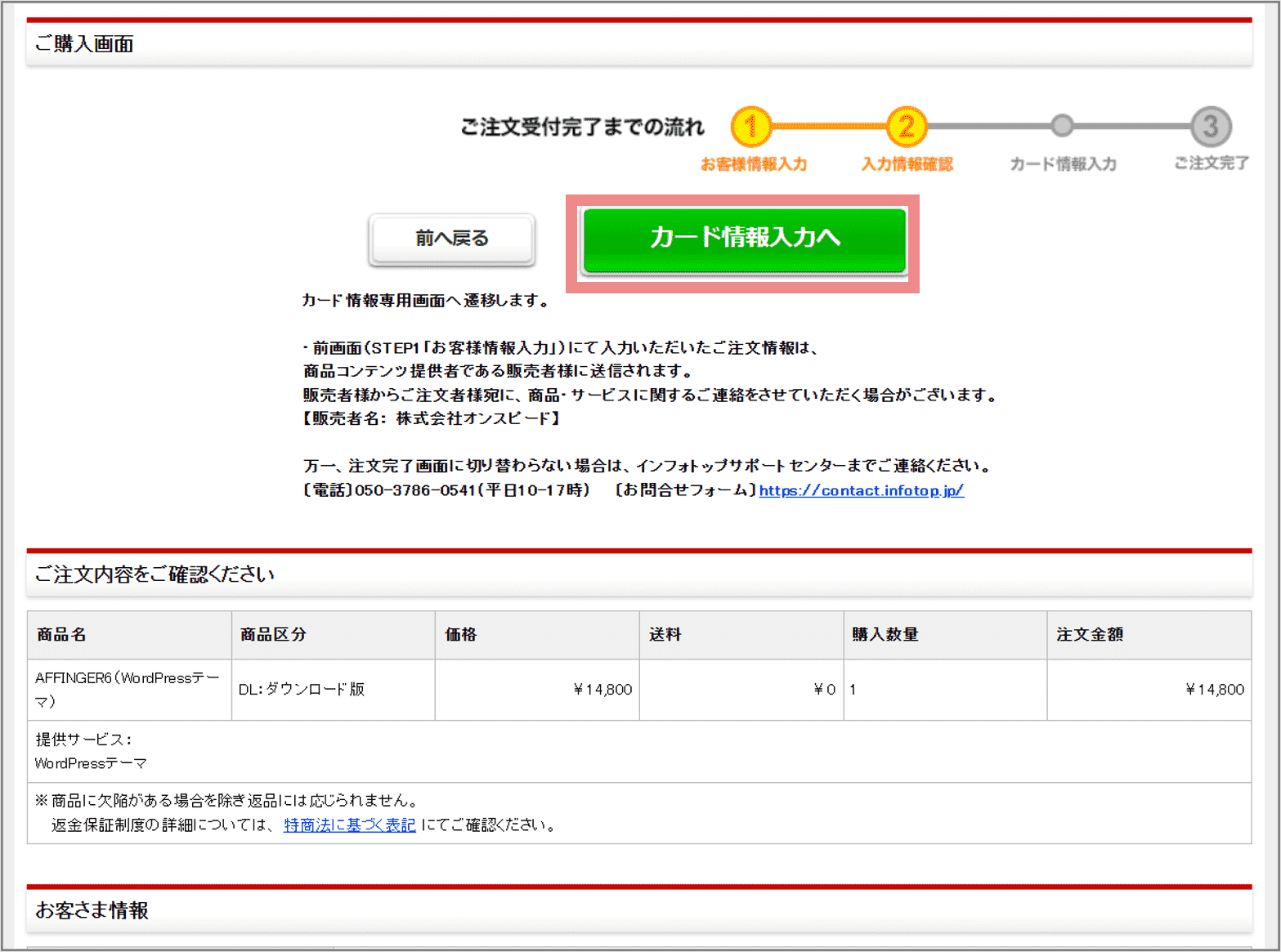 注文内容、および入力したお客様情報、支払方法を確認して「カード情報入力へ」をクリックします。