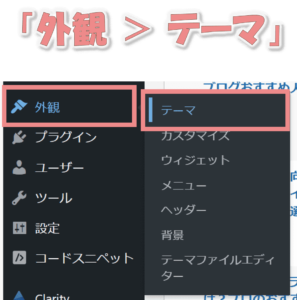 WordPressの管理画面にアクセスして『外観 > テーマ』をクリックしてください。