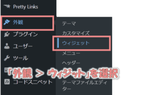 WordPressの管理メニューで「外観 > ウィジェット」を選択します。