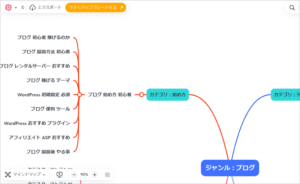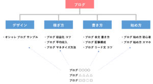 たとえば、テーマが「ブログ」なら、「ブログの書き方」「ブログの始め方」「ブログデザイン」「ブログ収益化」といったカテゴリが挙げられます。