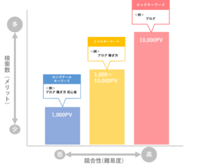 ロングテールキーワードは検索ボリュームが少なく、上位表示された際のメリットは小さいものの、競合も少ないといった特徴があります。
