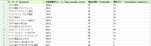 各キーワードの『検索ボリューム』や『競合性』を調査して、どのキーワードで記事を書くかを精査する作業です。