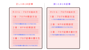 そのため、最初にまとめ記事を作って全体の流れを把握したうえで、詳細記事を作るとスムーズ作業を進めやすいです。