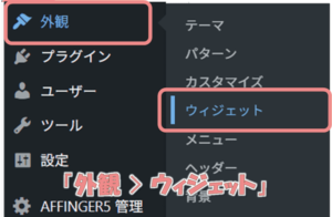 「外観」>「ウィジェット」をクリックして、ウィジェット設定画面を開きます。